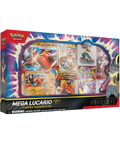 Pokemon Mega Evolutions Figure Collection - 1 figure of Mega Lucario ex, 1 etched foil promo card of Mega Lucario ex, and 1 oversize promo card of Mega Lucario ex, 5 Pokémon TCG booster packs, A code card for Pokémon TCG Live.